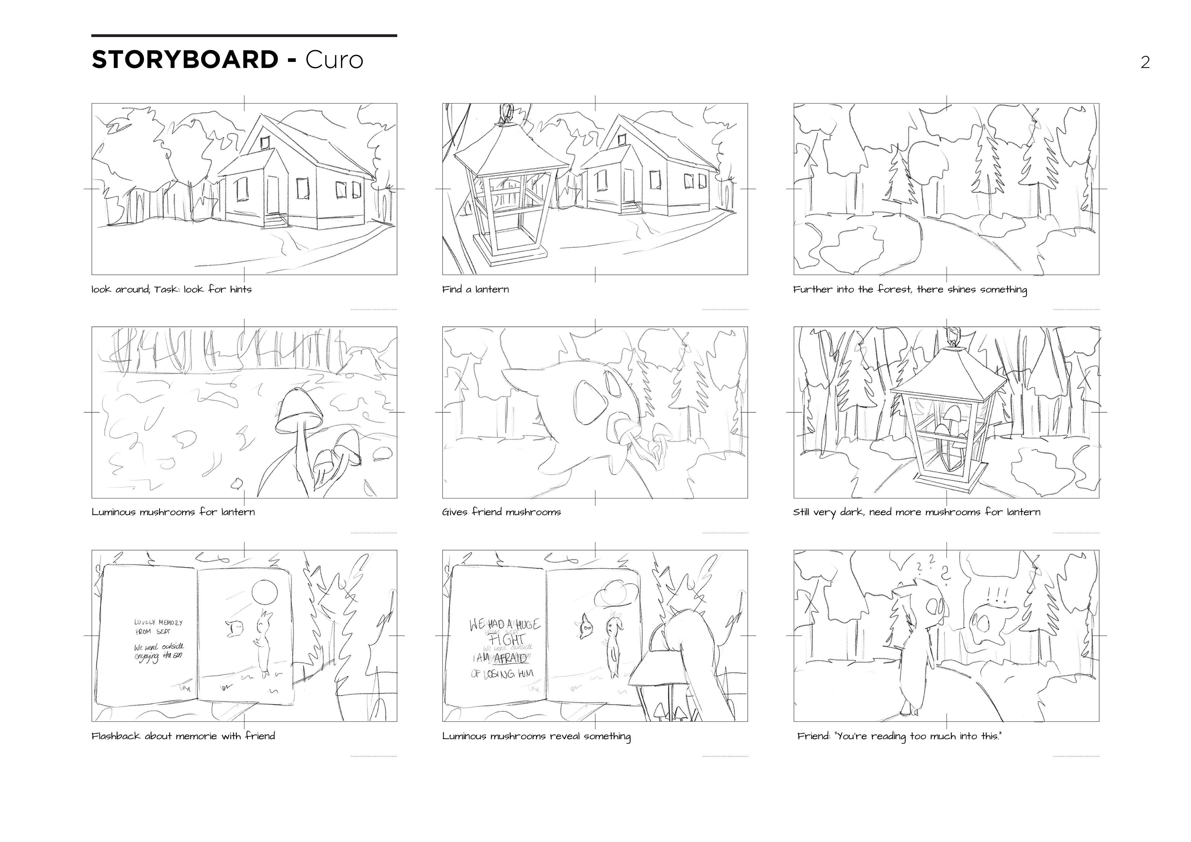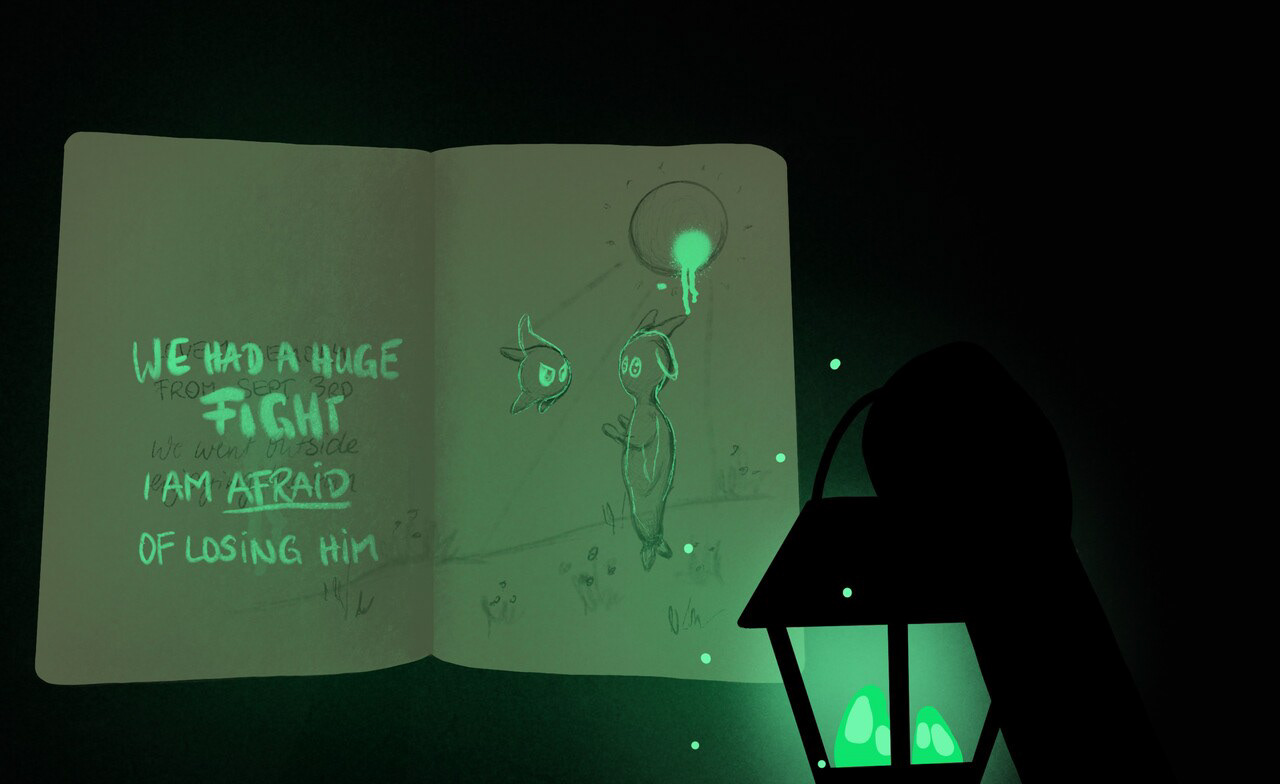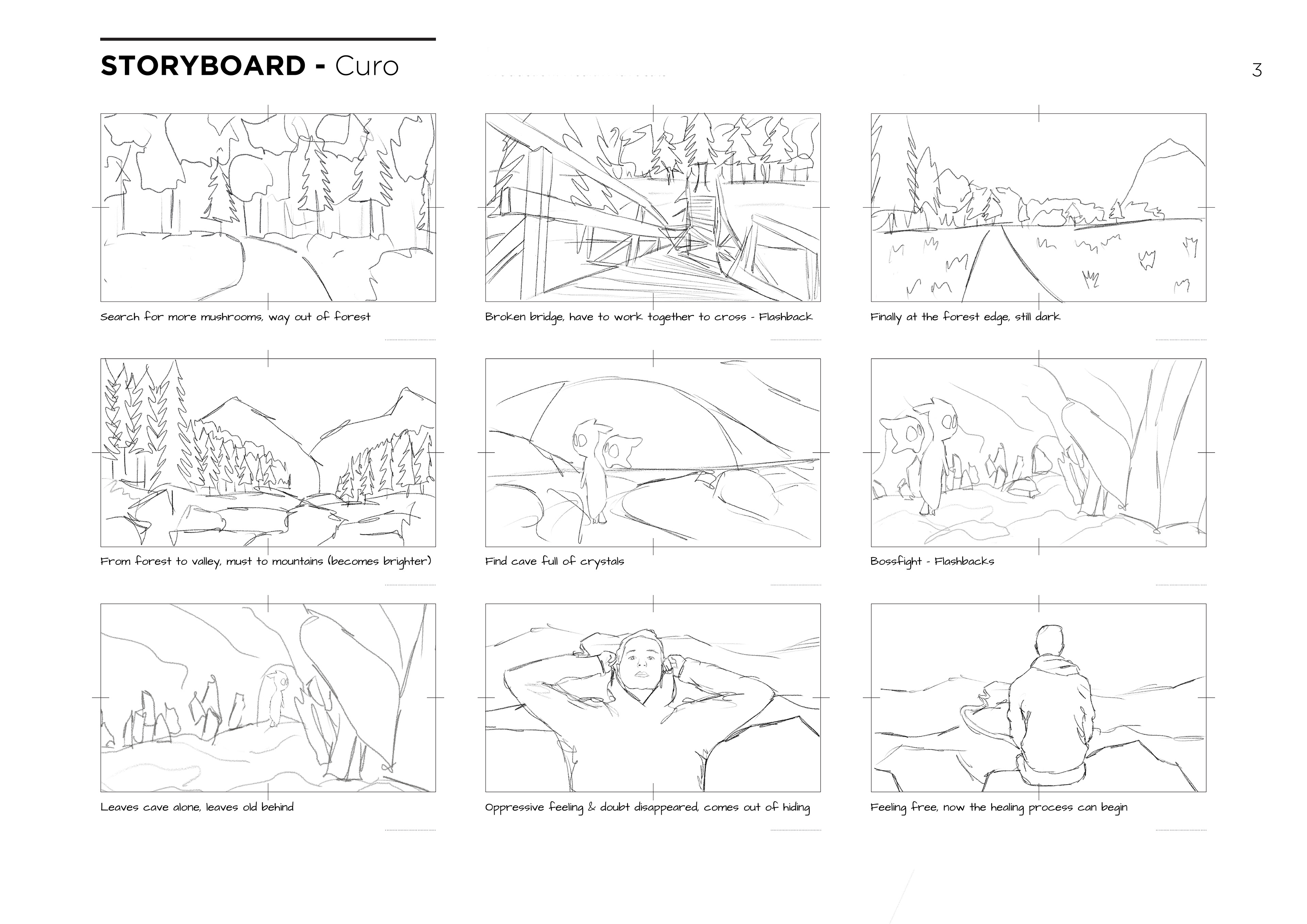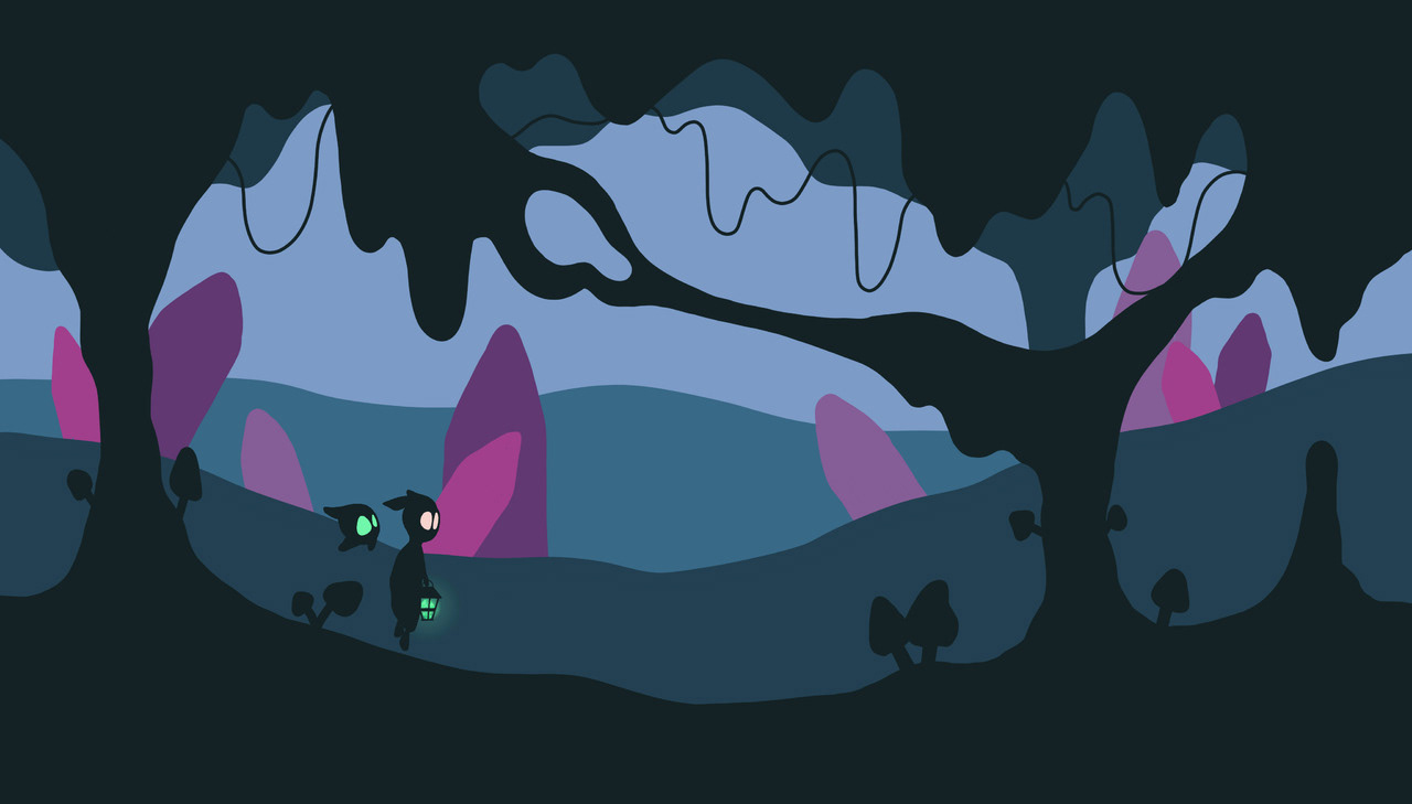 The further the game progresses and the more memories come back, the brighter the surroundings become. From the oppressive, pinching, dark forest, to the valley, to the mountains with the colorful crystal cave. Until, in the end, Curo comes out of the cave alone and has broken away from the toxic friendship. Finally, the real shape also opens up to the player and one no longer sees only a shadow.