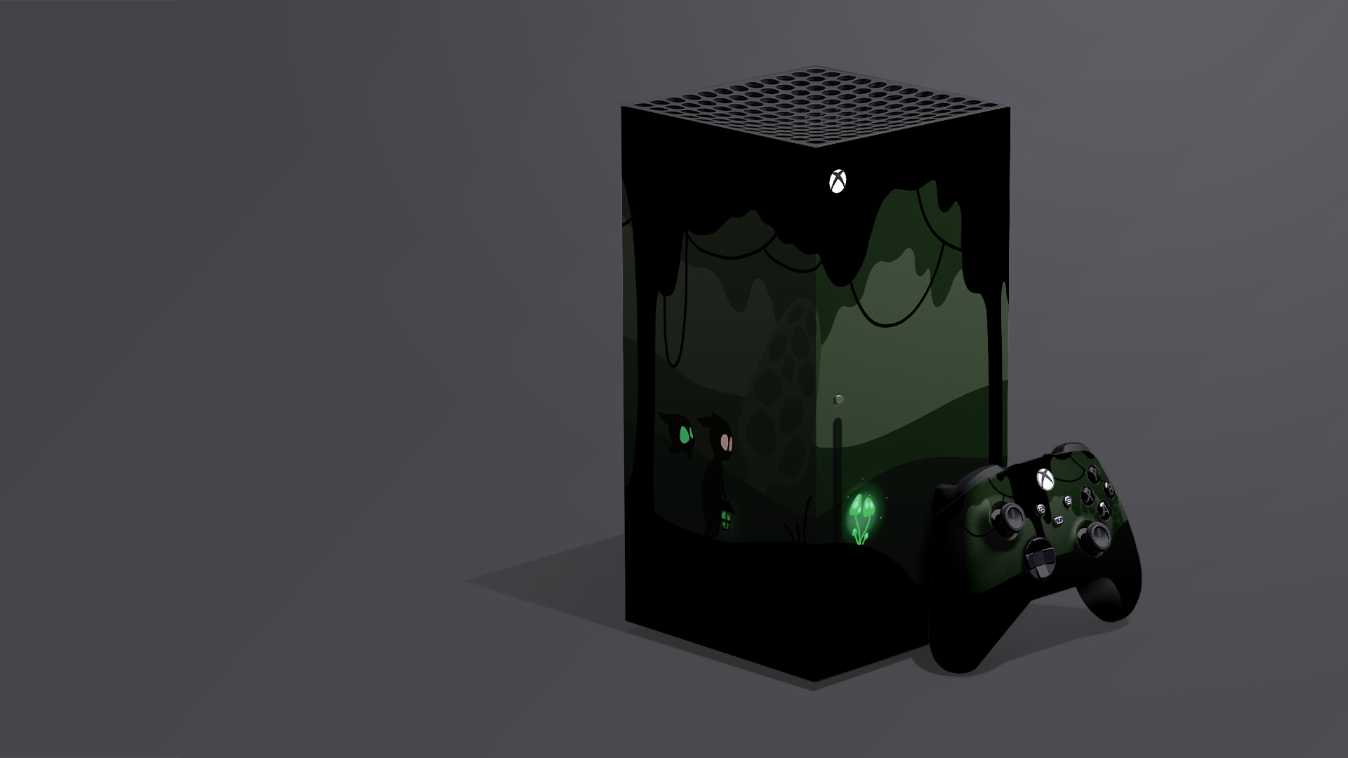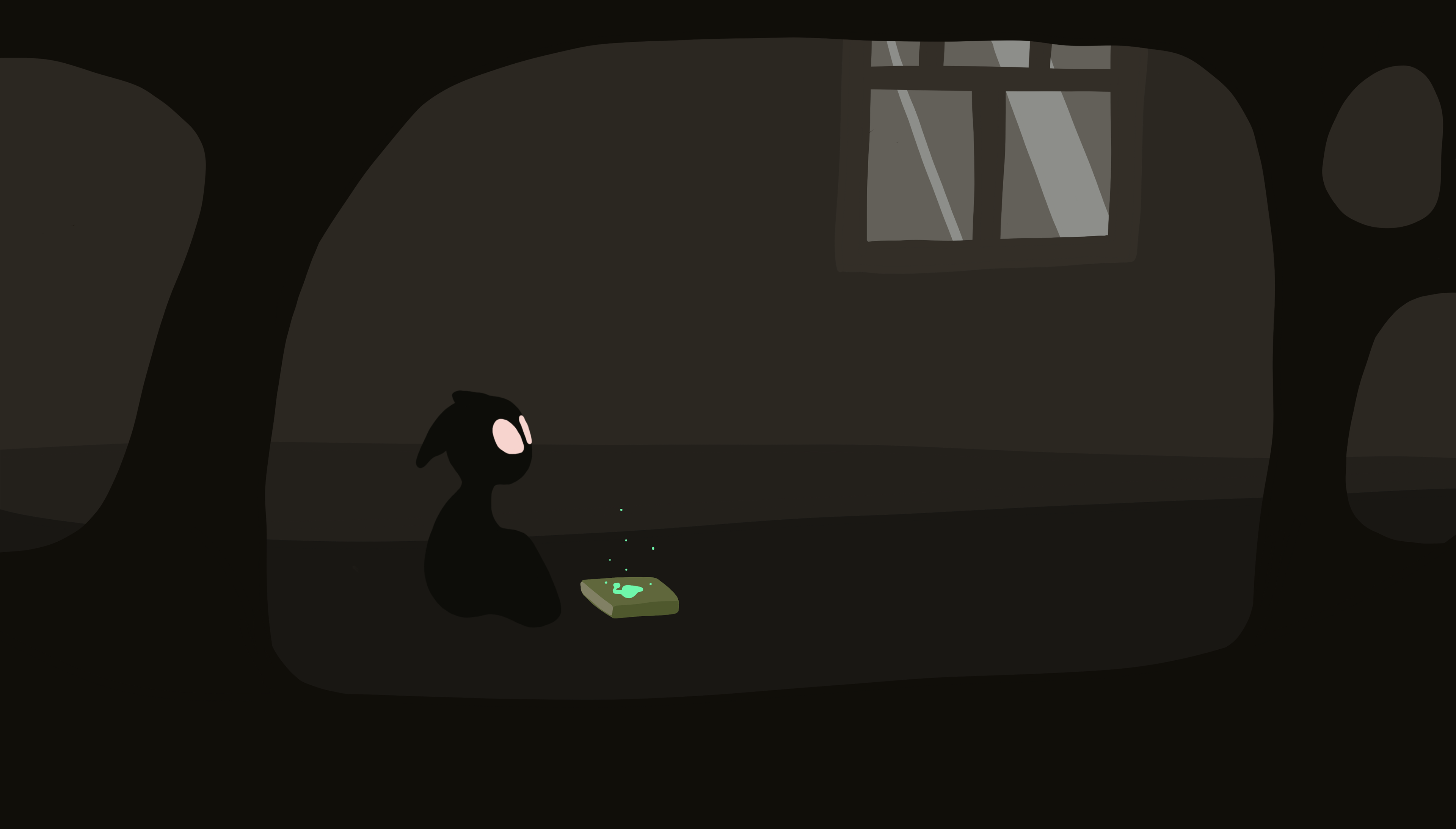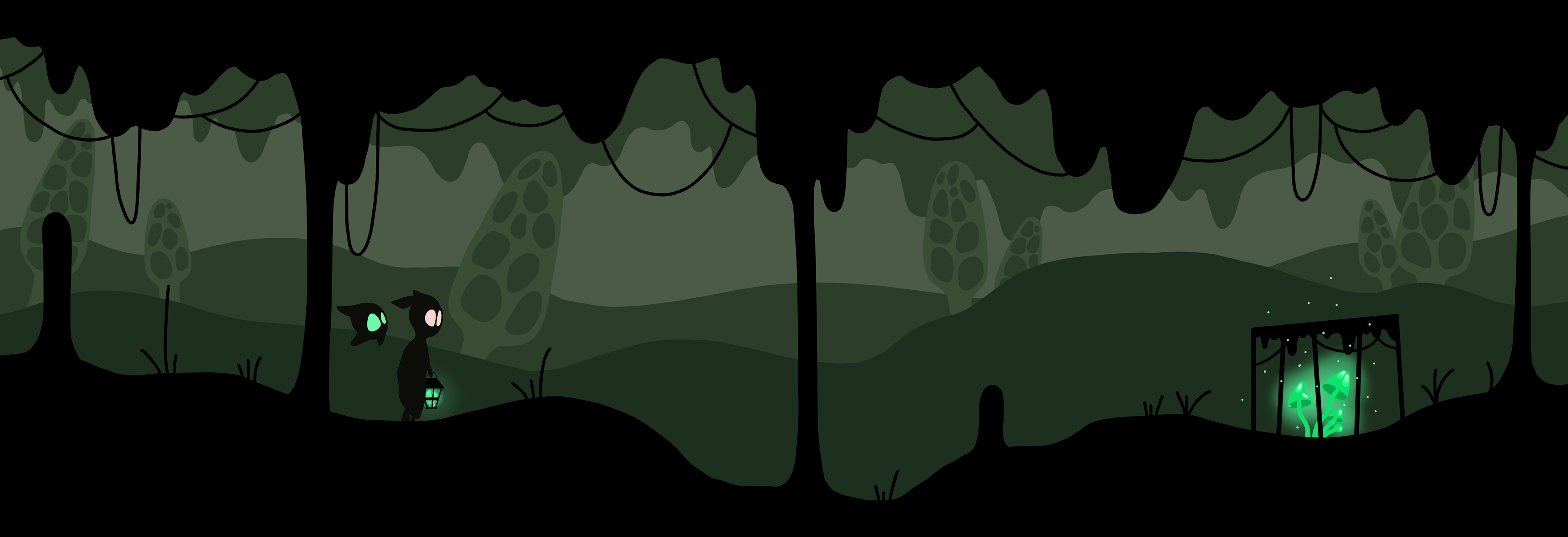 From the cabin we go out into the forest, which appears mystical and dark. On the one hand, the glowing mushrooms provide light and thus brighten up the darkness; on the other hand, the toxic aspect of these mushrooms can already be seen in the glowing green.
