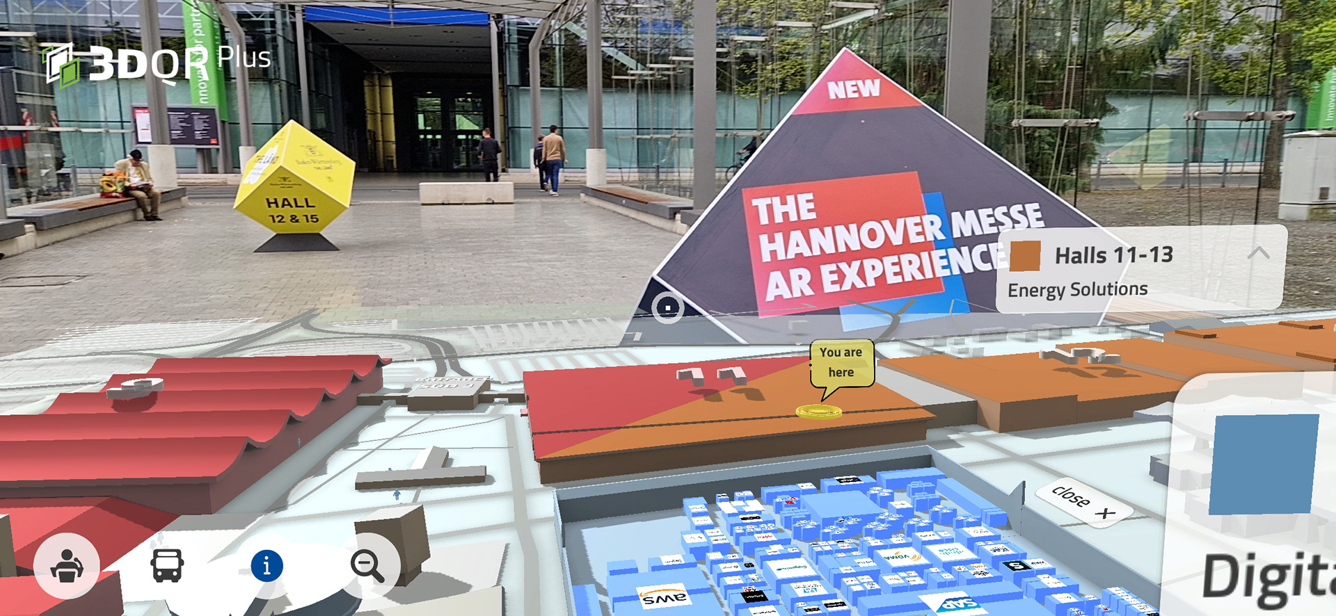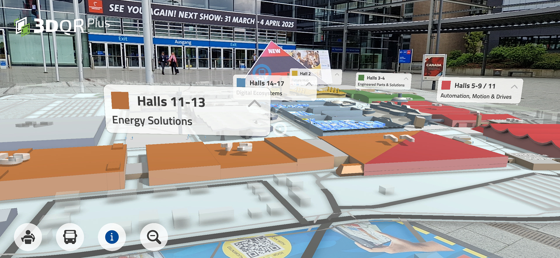 Strategically positioned at eight key locations within the exhibition grounds, expansive QR codes were embedded into the flooring. Upon scanning these codes with the "3DQR Plus" app, visitors unlocked captivating augmented reality content, enriching their interaction with the event. Furthermore, the app seamlessly integrated an interactive exhibition map, providing real-time navigation assistance to visitors. Not only did it pinpoint the current location of the QR code, but it also facilitated effortless exploration of the exhibition grounds. A standout feature was the full interactivity of Halls 14-17, empowering visitors to access comprehensive exhibitor details and effortlessly traverse the halls. Should attendees seek out specific companies, the app swiftly guided them, enhancing convenience and discovery.