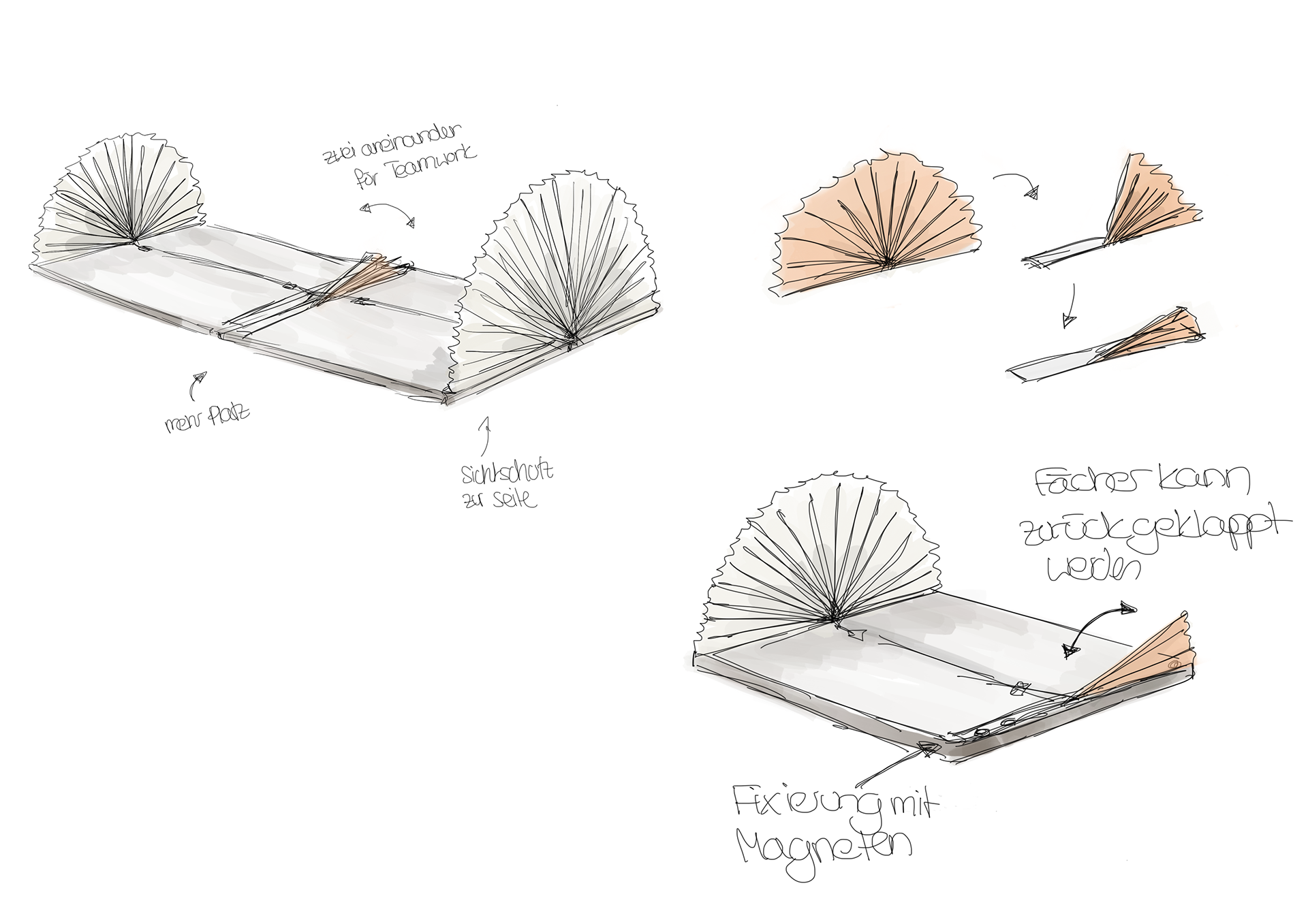 Due to the fold-back compartment and the possibility of placing two modules next to each other, the concept is particularly suitable in open office concepts for individual and team work. Regarding the chosen concept and requirements, the elaboration has evolved in the direction of a mobile workstation designed for longer temporary work.