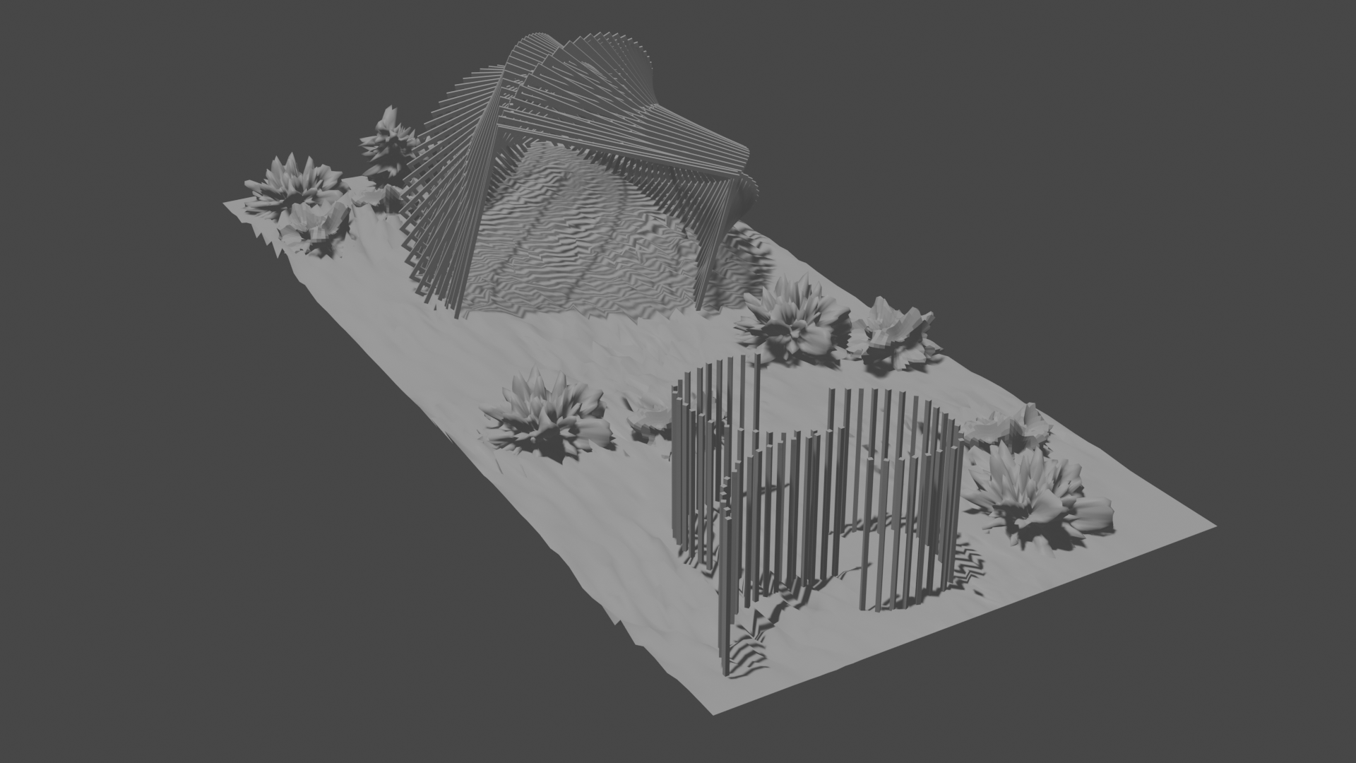 The goal was to design a place that offers a lot of room for interpretation. It was confirmed by the different perceptions of the objects. For some, they are deformed stones, others see flowers or crystals in the small raised objects that spread over the surface. Furthermore, the small sticks obstruction was interpreted and interacted with as a labyrinth and prison.